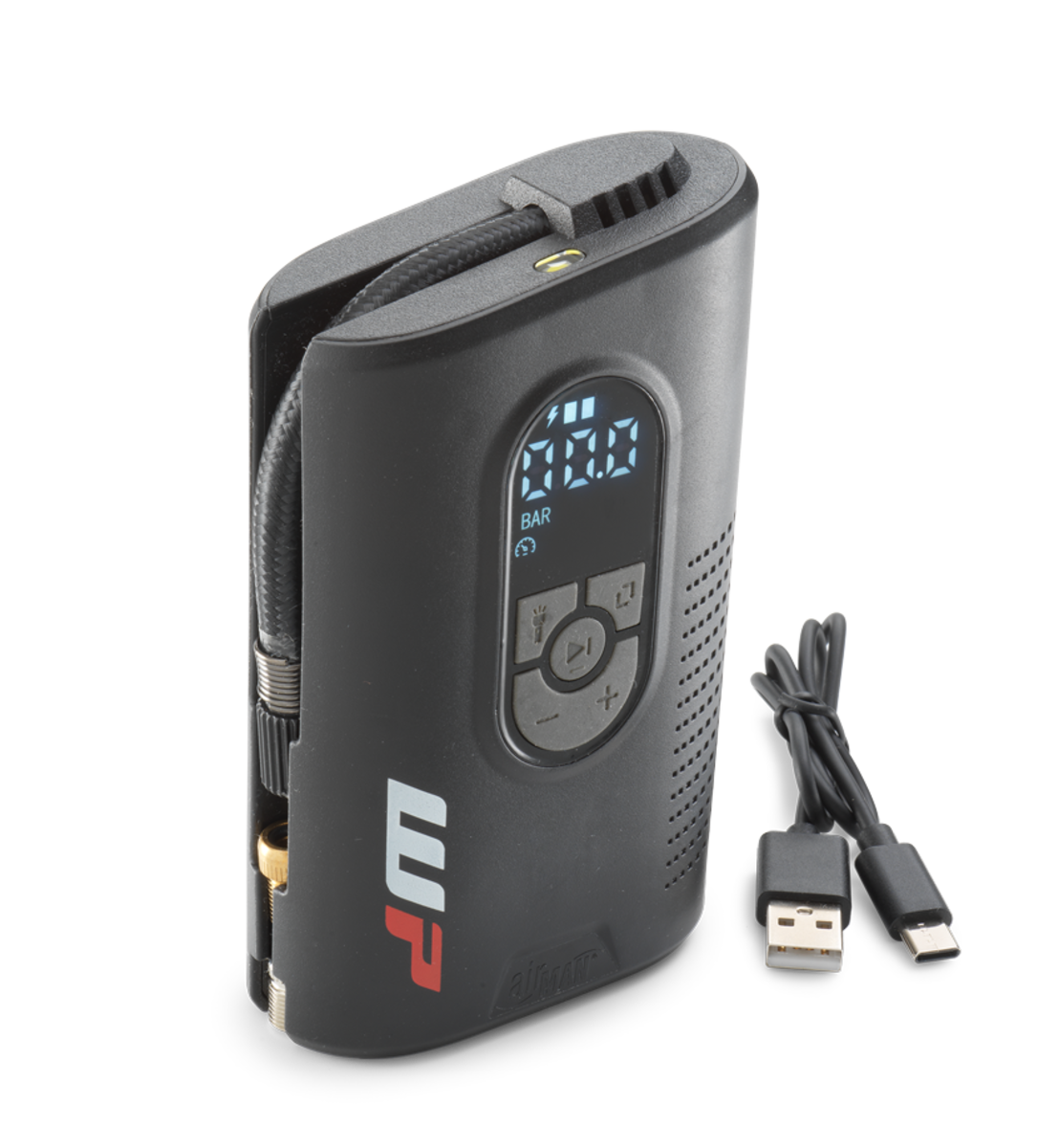 <ul><li>AIR COMPRESSOR KTM</li><li>Practical companion for national and international trips</li><li>Convenient and easy to use</li><li>Extremely low weight</li><li>- 7,4 V air compressor</li><li>- Maximum air pressure: 7,59 bar / 110 PSI / 759 kPa</li><li>- Power: 7,4 V; 6 A; 44,4 Watt</li><li>- Maximum duration: 15 Minuten (enough to re-fill both tyres)</li><li>- Integrated litium-Ion battery with 7,4 V, 2.200 mAh</li><li>- Hose and adapters can be stored inside the housing</li><li>- Charging with USB-C-connection</li><li>- Dimensions: 131 x 80 x 40 mm</li><li>- Weight: 0,33 kg</li></ul>