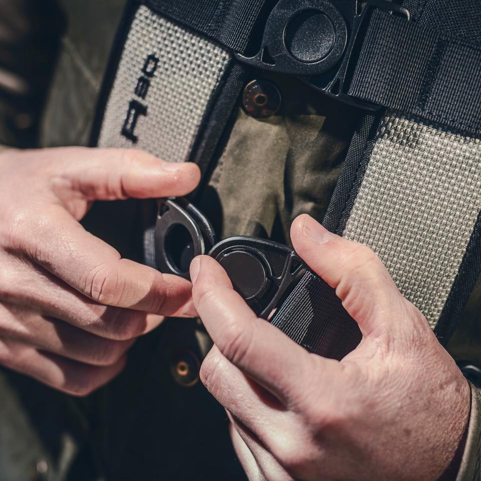 - Chingi specifice Kriega de aluminiu pentru ajustare a hamului in zona soldului.