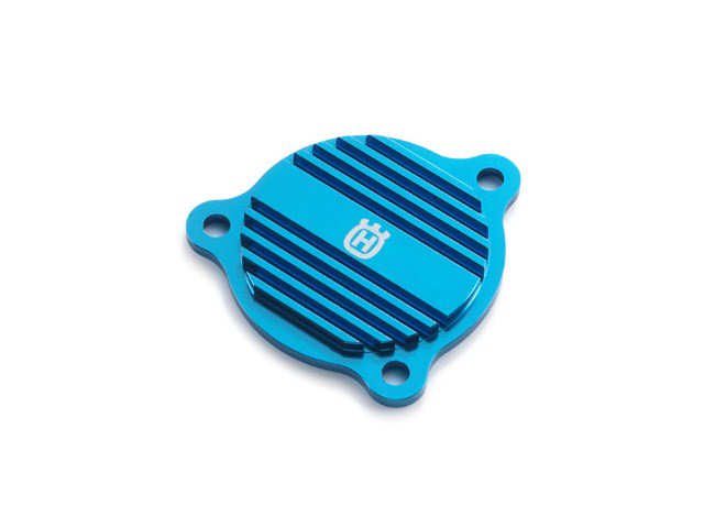 - Capacul pentru pompa ulei este fabricat din aluminiu anodizat albastru Husqvarna
